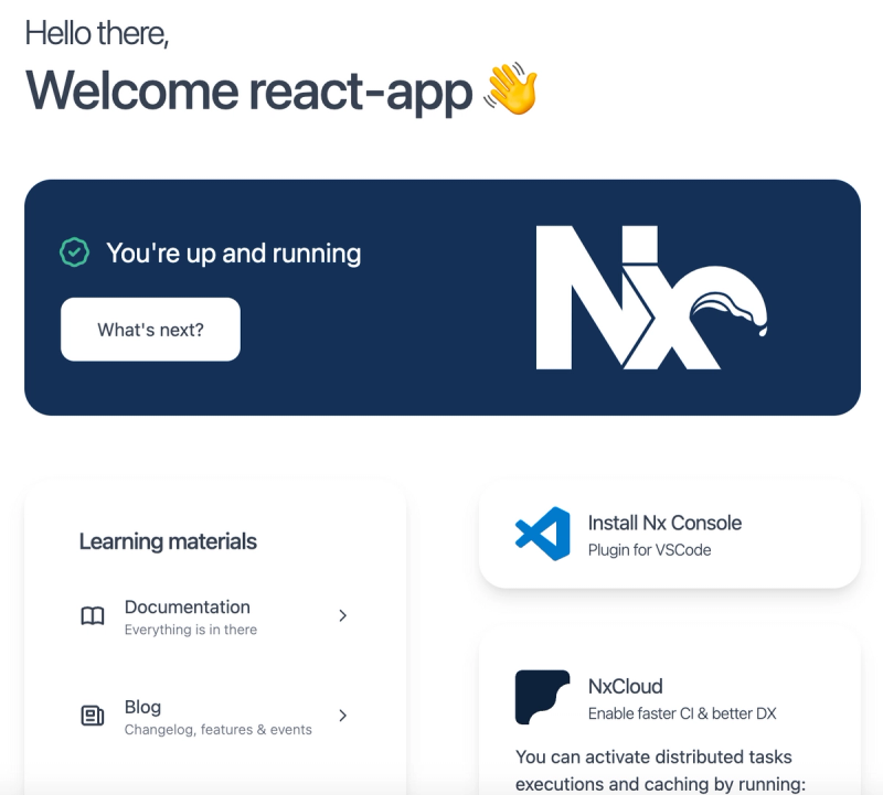 If you run the app again via nx serve react-app and go to http://localhost:4200 you will get that following screen: